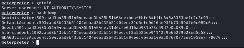 For instance, we can use commands like hashdump to extract password hashes if we have sufficient privileges on the target machine, without needing to upload additional tools or manually perform steps such as reg save and then dumping the registry.